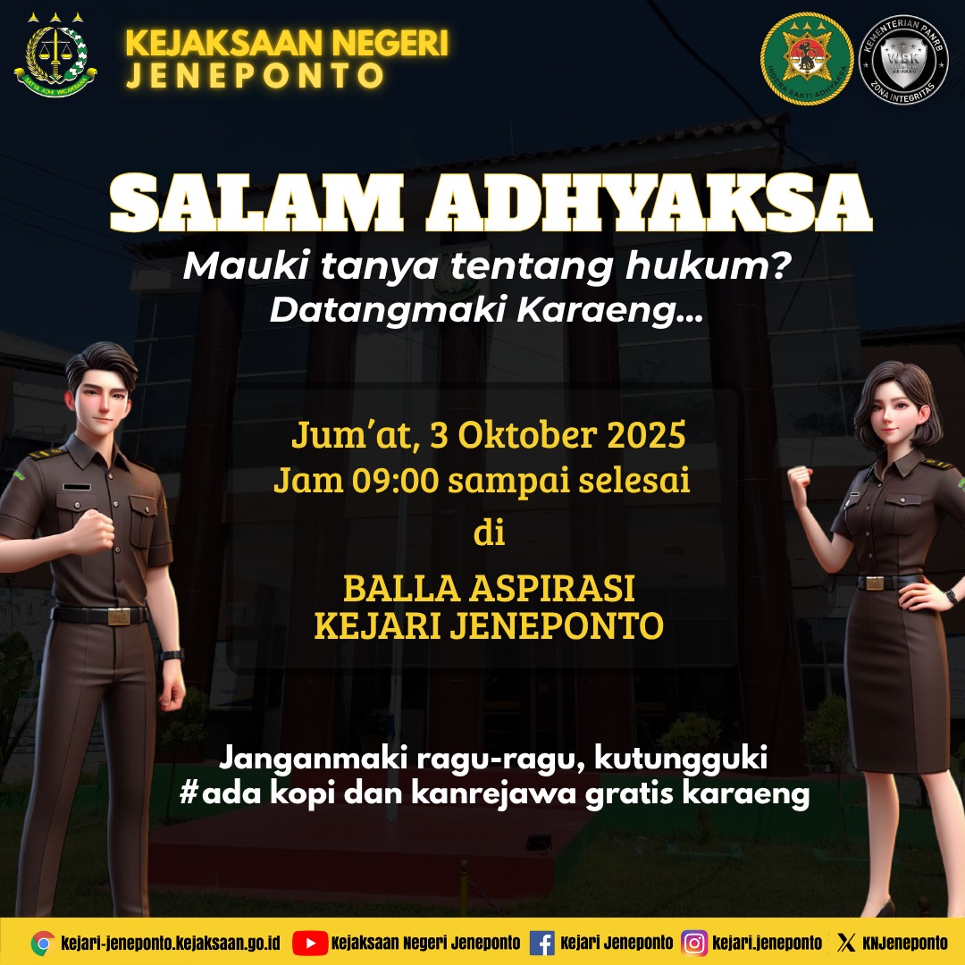 RAKYAT NEWS, JENEPONTO – Kejaksaan Negeri Jeneponto akan menyelenggarakan kegiatan Balla Aspirasi Kejaksaan pada hari Jumat, 3 Oktober 2025 pukul 09.00 WITA, bertempat di halaman Kantor Kejaksaan Negeri Jeneponto. Kegiatan ini menjadi wadah terbuka bagi masyarakat untuk menyampaikan aspirasi, pengaduan, maupun saran terkait penegakan hukum dan pelayanan kejaksaan. Balla Aspirasi dihadirkan sebagai bentuk keterbukaan informasi serta komitmen Kejaksaan dalam membangun hubungan yang lebih dekat dengan masyarakat.