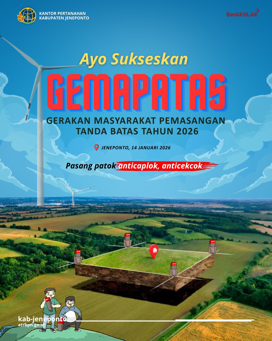 RAKYAT NEWS, JENEPONTO – Dalam rangka mendukung percepatan pendaftaran tanah dan tertib administrasi pertanahan, Kantor Pertanahan Kabupaten Jeneponto mengajak seluruh masyarakat untuk menyukseskan GEMAPATAS (Gerakan Masyarakat Pemasangan Tanda Batas) yang akan dilaksanakan pada Rabu, 14 Januari 2026 di wilayah Kabupaten Jeneponto.